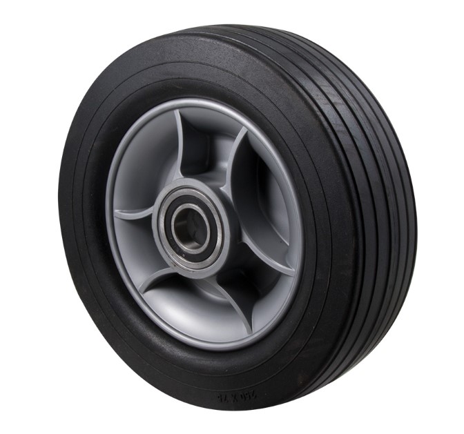 Puncture-proof wide utility wheel, 250mm x 75 mm black rubber tyre, plastic center, precision bearing, 20mm ID (inside diameter), load rating 180 kg.
