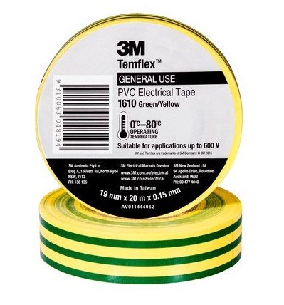 3M Temflex Electrical Tape 1610 is a general purpose vinyl insulating tape designed for use in phase identification, colour coding of motor leads and piping systems and for marking safety areas. It has very good resistance to abrasion, moisture, alkalis, acids and varying weather conditions.