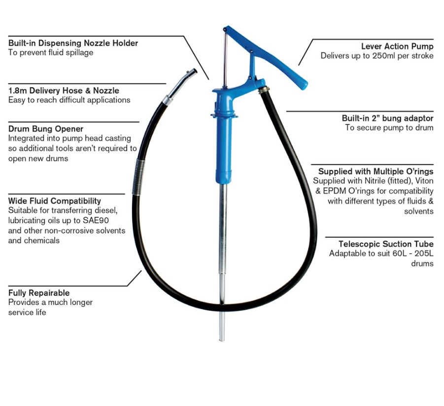 A classic Macnaught hand pump, the MULTI- PURPOSE LEVEL DRUM PUMP is the ideal pump for transferring a wide variety of fluids such as diesel fuel, lubricating oils and an extensive range of non-corrosive fluids and chemicals.