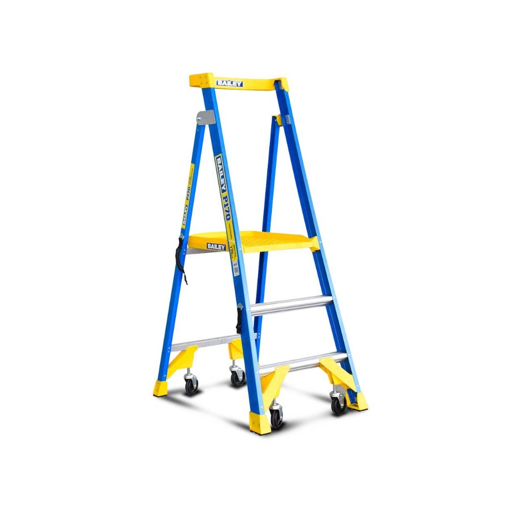 The Bailey P170 range of platform stepladders offers the largest in class platform measuring 610 X 457mm. With a 170kg load rate and industrial duty rating it is extremely durable and job site ready. Available in both aluminium and fibreglass, with a factory fitted carry handle and castor system it will improve safety and efficiency on your work site. Safety gates are available as an accessory.