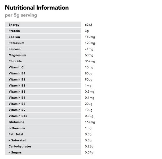 Sodium Chloride, Potassium Chloride, Magnesium Chloride, Calcium Citrate Tetrahydrate, Glutamine, Sea Buckthorn, Panmol B, L-Theanine, Silica Sipernat, Natural Flavour, Citric Acid, Natural Colours (Curcumin, Blue Spirulina, Red Beets), Thaumatin, Glycine (amino acid), Rice Maltodextrin.