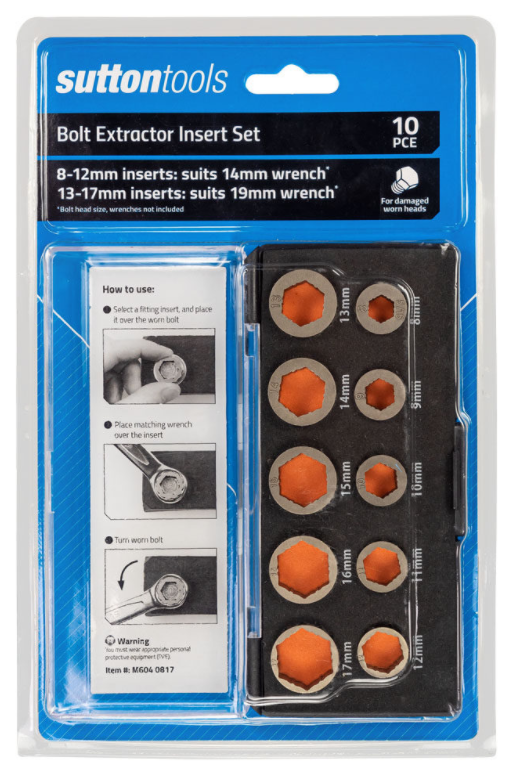 Designed to remove bolts with damaged and worn heads. 8, 9, 10, 11 & 12mm inserts: suits 14mm wrench*. 13, 14, 15, 16 & 17mm inserts: suits 19mm wrench*