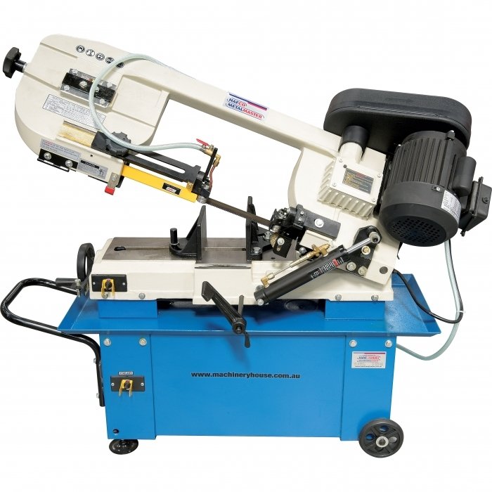 BS-7L - Metal Cutting Band Saw - Swivel Vice Mitre Cuts Up To 45º & Includes Hydraulic Downfeed Control 305 x 178mm (W x H) Rectangle Capacity Overview The BS-7L medium duty metal cutting band saw has many features on offer with a capacity of up to 178mm diameter or 305 x 178mm in steel. There is a choice of four blade speeds via an adjustable 4 stage pulley system so that the cutting speed can be changed to suit a wide range of materials, whilst the built-in coolant system ensures maximum cutting efficiency and long blade life. The cutting operation works automatically with the weight of the head providing the cutting force and a limit switch shutting the machine down when the cut is complete. The weight of the head is counterbalanced by an adjustable hydraulic damper to control the feed rate, an excellent machine choice for maintenance shops, medium steel fabrications, and engineering workshops. Features 305 x 178mm (W x H) rectangular capacity Adjustable hydraulic feed cutting rate for multiple applications Mitre cuts to 45º using calibrated vice Built-in coolant system for maximum cutting efficiency Limit switch stops machine when cut is complete Adjustable blade roller guides provides accurate cutting Adjustable 4-speed pulley drive system enabling 22-34-49-64mpm cutting speeds Adjustable length stop for repetition cutting Coolant system with flow control valve Wire wheel brush to clean swarf from blade Portable - on wheels for ease of use Vertical cutting table included Automatic electric cut-out switch Heavy-duty 0.75kW 1hp 240V fully enclosed fan-cooled motor
