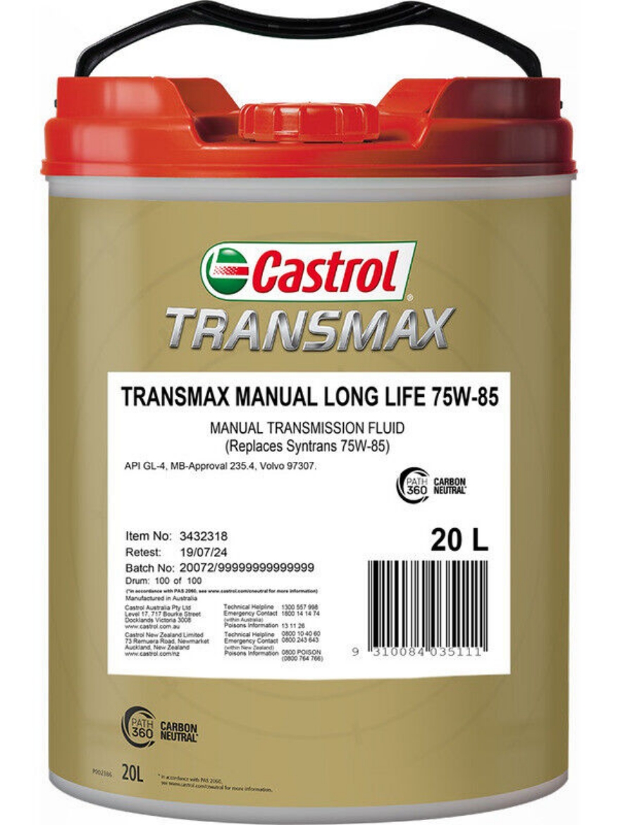 Castrol Transmax Manual Long Life 75W-85 is a full synthetic transmission fluid recommended for most commercial vehicle manual transmissions (truck, bus, light commercial vehicle) where API GL-4 lubricants are required. These transmissions are generally larger and subjected to higher loads and temperatures than those in passenger cars: this product was developed for these particular requirements and is approved by a number of manufacturers.