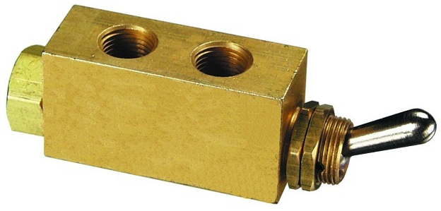 - Function: 3-way, normally-closed valve. When the toggle is in the "on" position, air flows from the inlet to the outlet, and the exhaust port is blocked. In the "off" position, the inlet is closed, and the outlet is vented to the atmosphere.