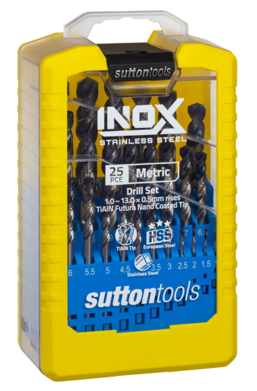 Sutton Tools Inox jobber drills are an industrial quality drilling solution specially designed for superior performance in stainless steel. Tailored to overcome the difficult-to-machine material properties of stainless steel, Inox drill bits have a fast spiral, short flute and unique stepped core design providing a smooth and effortless cutting action never before seen. For added wear resistance, these drill bits feature the latest generation Futura Nano PVD coated tip. Inox drill bits have been independently tested to achieve 70% more tool life in stainless steel compared to standard drill bits.