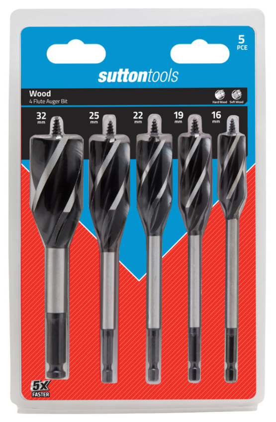 Sutton Tools Four Flute Auger Bits are designed for machine and hand drilling into hard and soft wood. Four cutting edges makes cutting up to 5 times faster than standard spade bits.