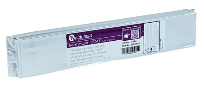 Hydrogen controlled ("low hydrogen") E7016 series stick welding electrodes with a special Twin Flux Coating for superior arc stability - in Foil-Sealed 2KG Vacuum Packs. Commonly used for mild or high strength steel, where the joint requires higher strength than regular "GP" electrodes, such as highly restrained joints or components subject to higher load stress. Also used as a buffer layer prior to hard facing. 16XT welding rods are All-Positional (except for vertical down), easy striking & smooth running, with low spatter & easy slag removal. Available in 2.5mm, 3.2mm & 4.0mm. AWS A5.1 E7016 H8 & AS/NZS 4855: B E4916 A U H10 classifications.