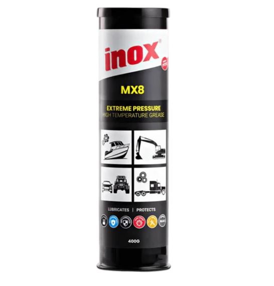 The extreme pressure and anti-wear properties of INOX MX8 grease gives long service life under high loading and shock loading conditions from very low to very high temperature environments. These special characters of shear stability, combined with the inclusion of effective rust, oxidation and corrosion inhibitors and tackiness adhesives, ensures this grease to perform in almost any application. INOX MX8 is a lithium complex  grease, which means that it will hold together extremely well under high pressure and variable temperatures.