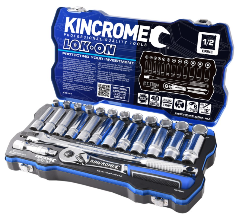 Kincrome LOK-ON™ Sockets, Sets and Accessories have been engineered beyond world-class benchmarks, exceeding all international torque and lifetime standards. Offering unique patented features such as the LOK-ON™ Socket’s ability to loosen up to 85% rounded/damaged fasteners, the LOK-ON™ range has been developed with both function and style in mind. Each component within the LOK-ON™ range includes features above and beyond the market’s expectation, setting a new benchmark for the professional quality tool industry.