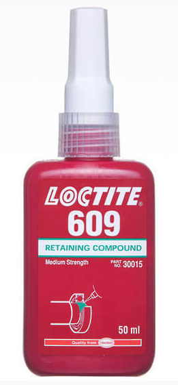LOCTITE 609 is a green, high strength methacrylate ester acrylic retaining compound designed for the bonding of cylindrical fitting parts. The product cures in the absence of air between close fitting metal surfaces. Typical applications include rotor to shafts in fractional and subfractional horsepower motors. Locks bushings and sleeves in housings on shafts. Augments press fits.