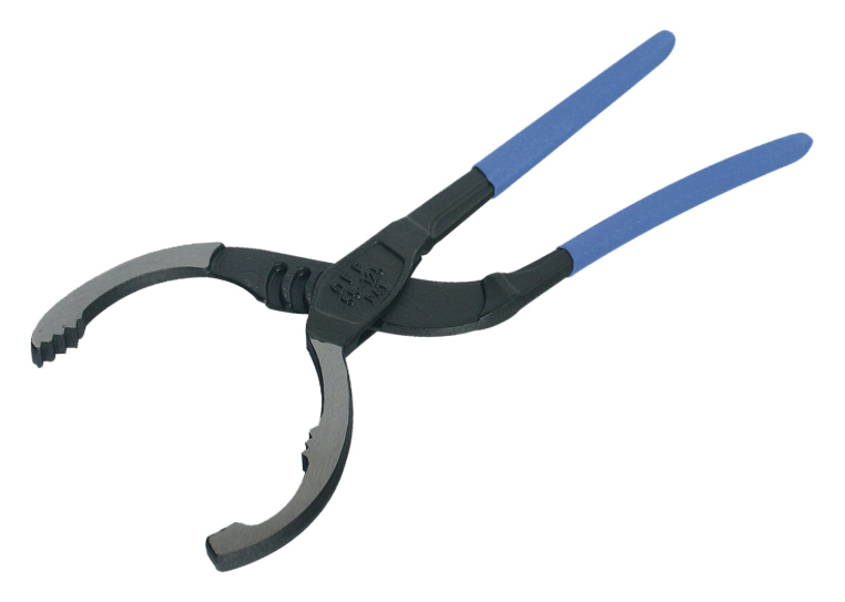 Adjustable serrated jaws lock into position providing maximum grip on "oily" oil filters