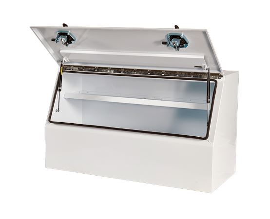 The half open toolbox is perfect for the tradespeople who want to access their toolbox without having to drop their sides. A convenient narrow shelf for grab and go storage of small tools and parts.Construction: 1.5mm steel sheetDoor Opening: Half openKeys: 2 keysBENEFITSEasy access without dropping ute sides and tailgate290mm tray side clearanceBOX DETAILSExternal Locking Points: 2 x Whale tail compression handlesHinge: Full length piano hingeRubber Seals: Dust & water sealShelves Size (L x W): 894mm x 250mmMounting System: Fixed PositionGas Strut Replacement: 345X120X200NSteel Shelf Replacement: 1220X250MM Weight: 54kgDimensions (L X D X H): 1220mm X 505mm X 705mmColour: White