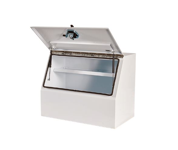 The half open toolbox is perfect for the tradespeople who want to access their toolbox without having to drop their sides. A convenient narrow shelf for grab and go storage of small tools and parts.Construction: 1.5mm steel sheetDoor Opening: Half openKeys: 2 keysBENEFITSEasy access without dropping ute sides and tailgate290mm tray side clearanceBOX DETAILSExternal Locking Points: 1 x Whale tail compression handlesHinge: Full length piano hingeRubber Seals: Dust & water sealShelves Size (L x W): 894mm x 250mmMounting System: Fixed PositionGas Strut Replacement: 345X120X200NSteel Shelf Replacement: 900X250MM Weight: 45kgDimensions (L X D X H): 900mm X 505mm X 705mmColour: White