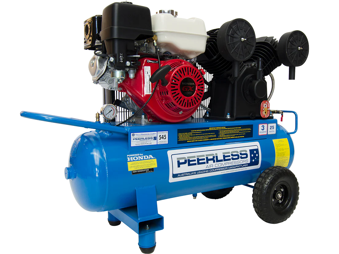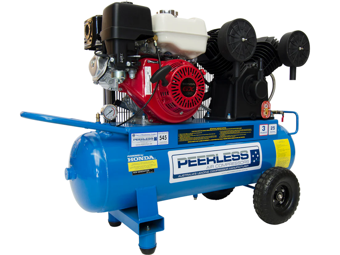 PEERLEXX COMPRESSOR PV25PES PETROL ELECTRIC START PORTABL, IDLER CONTROL, BELT DRIVE, HONDA GX270, 545LPM @ 100PSI, MAX 145PSI, 68L TANK
