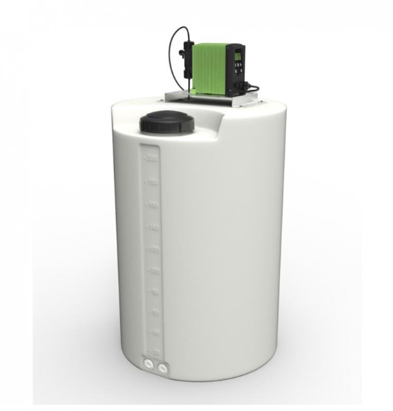The ideal set up for dosing chlorine in an easy-to-use system, is for a dosing pump to be mounted to a small Polymaster dosing tank
