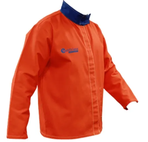 A cool, comfortable & very cost effective hi-vis welding jacket! Now available with 7-year warranty. Sewn with heat resistant Kevlar thread for longer life. FR (fire retardant) treated cotton, designed for light to medium protection against grinding sparks and welding spatter. High visibility orange, adjustable collar, pen pocket & internal pocket. The FR welders jacket with big features and small cost!