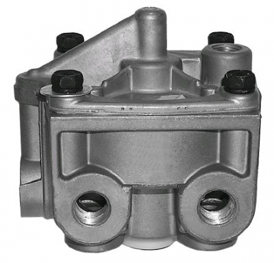 The R-12P relay valve is a special purpose relay designed specifically for use on trailers and converter dollies. This 0 p.s.i. crack and differential relay speeds up brake application signals to provide an equal or balanced pressure signal to all trailer and dolly brakes on double and triple trailer combinations. By maintaining the same application signal across the entire train of trailers this pilot operated relay valve aids in achieving overall vehicle brake balance and stability.