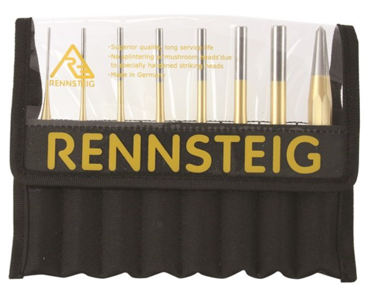 - Set of seven pin punches and one centre punch in durable fabric wallet