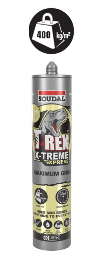 T-Rex X-treme is a high quality, neutral, elastic, adhesive sealant has been developed for extreme tack for immediate bonding of extremely heavy materials without additional support. It is based on the unique SMX Polymer technology developed by Soudal with an extremely high initial tack of 400 kg/m².