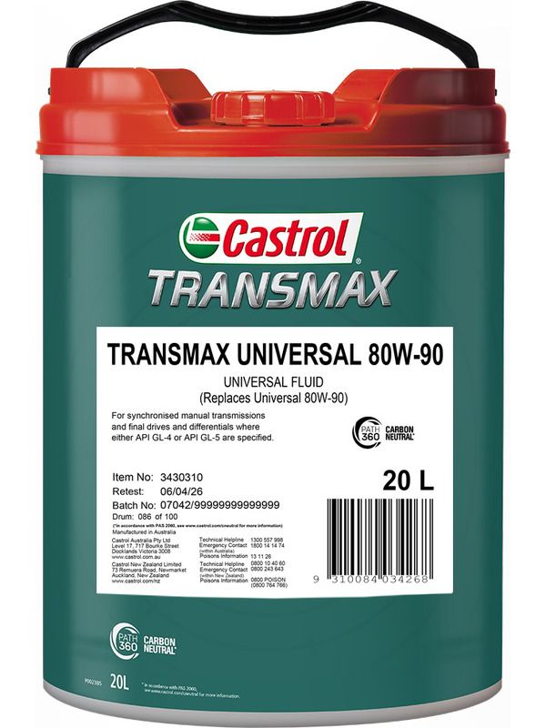 Castrol TRANSMAX Universal 80W-90 is a multipurpose gear lubricant for use in both synchronised manual transmissions and final drives and differentials where either API GL-4 or API GL-5 are specified.